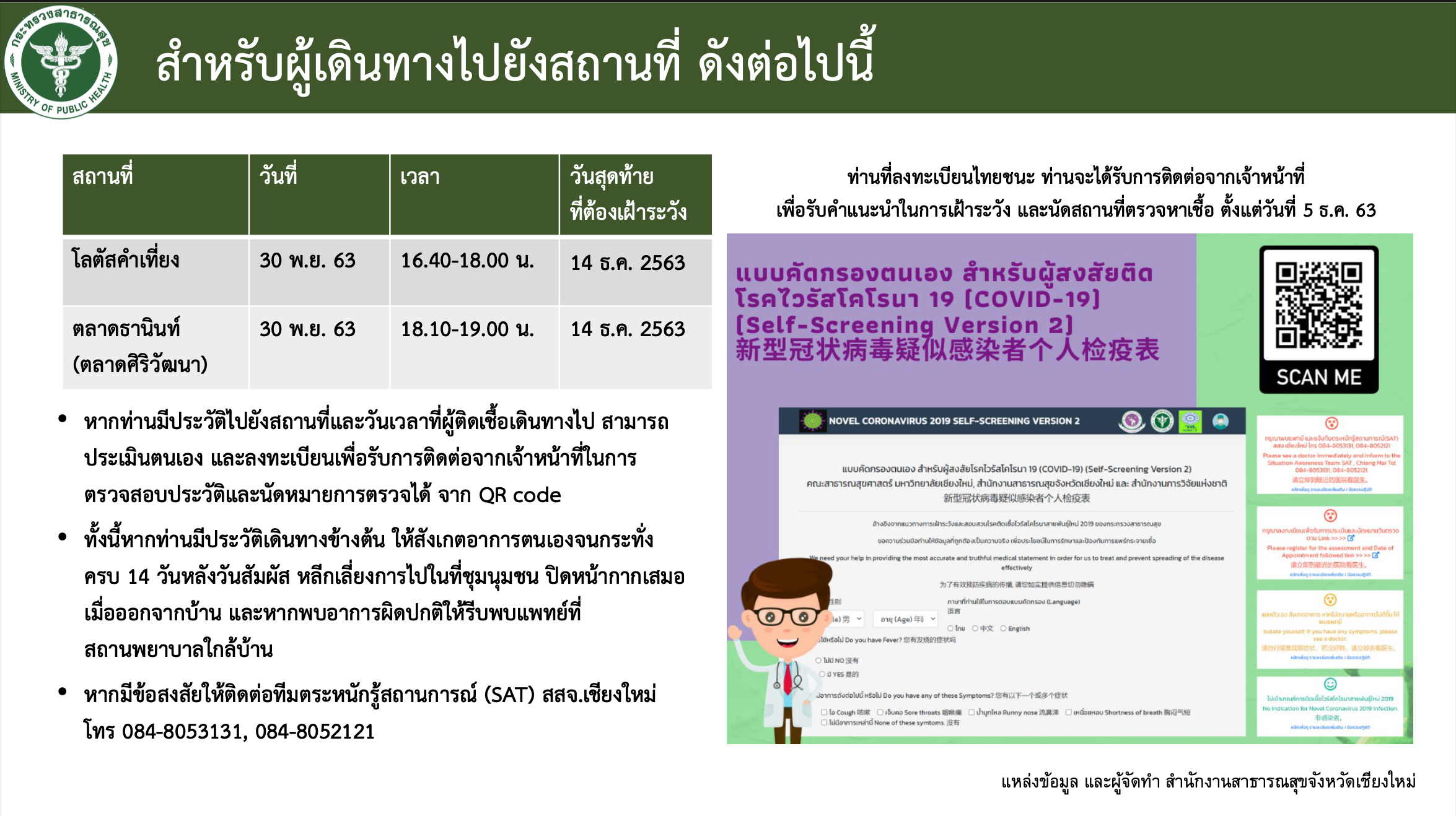 ขอประชาสัมพันธ์ให้กับประชาชนที่เดินทางไปยังสถานที่ 2 แห่ง ตามไทม์ไลน์ของผู้ป่วยรายนี้ ในวันที่ 30 พ.ย.63 เวลา 16.40-18.00 น. ที่เทสโก้โลตัส สาขาคำเที่ยง และเวลา 18.10-19.00 น. ตลาดศิริวัฒนา (ตลาดธานินท์) สามารถประเมินตนเอง และลงทะเบียนเพื่อรับการติดต่อจากเจ้าหน้าที่ในการตรวจสอบประวัติและนัดหมายการตรวจได้จากแอพพลิเคชั่น แบบคัดกรองตนเองสำหรับผู้สงสัยติดเชื้อไวรัสโคโรนา 2019 (https://cmsdm.net/Self-ScreeningV2/index.php)