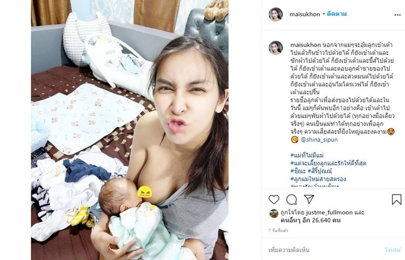 โดยคุณแม่คนสวยโพสต์ภาพหนึ่งขณะเปิดเต้าให้นมลูกน้อยดื่มจากอกแม่ พร้อมเผยข้อความสุดซึ้งของความเป็นแม่ที่ทำได้ทุกอย่างเพื่อลูกได้จริงๆว่า “นอกจากแม่ๆจะอุ้มลูกเข้าเต้าไปแล้วกินข้าวไปด้วยได้ ก็ยังเข้าเต้าและซักผ้าไปด้วยได้ ก็ยังเข้าเต้าและขี้ส์ไปด้วยได้