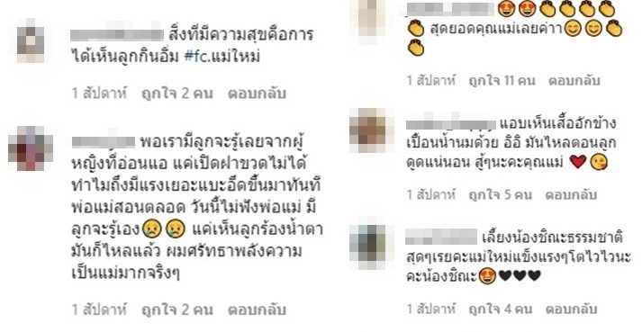 ขณะที่มีแฟนคลับและชาวเน็ตแห่ให้กำลังใจชื่นชมความเป็นแม่ พร้อมทั้งแสดงความเป็นห่วงคุณแม่คนสวยเปิดเต้าจนแห่โฟกัสเตือนด้วยความเป็นห่วง อาทิ “เลี้ยงน้องชิณะธรรมชาติสุดๆเรยคะแม่ใหม่แข็งแรงๆโตไวไวนะคะน้องชิณะ” , “สิ่งที่มีความสุขคือการได้เห็นลูกกินอิ่ม #fc.แม่ใหม่” , “เอาไปล้านคะแนนคุณแม่ รักที่สุด”