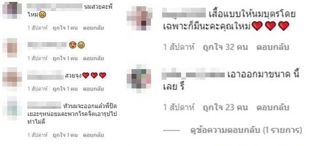 “เสื้อแบบให้นมบุตรโดยเฉพาะก็มีนะคะคุณใหม่” , “เอาออกมาขนาด นี้ เลย รึ” , “หัวนมจะออกแล้วพี่ปิดเยอะๆหน่อยแดะพวกโรคจิตเอารุปไปทำไม่ดี” , “เซ็ฟหน่อยคุนแม่ปาดนมออกละ” , “คุณใหม่เป็นผญ.ที่เรียลสุดๆ(ธรรมชาติ) น่ารัก และเป็นคุณยอดสุดแม่มากๆค่ะ รักอะ” เป็นต้น