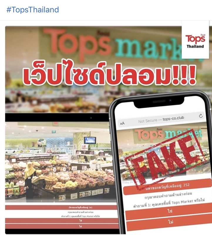 ท็อปส์ ไทยแลนด์ ขอเรียนให้ทราบว่า เราไม่มีการจัดแคมเปญดังกล่าว หากท่านได้รับลิงก์แปลกปลอมลักษณะดังกล่าว กรุณาอย่าคลิกเข้าไปโดยเด็ดขาด และขอความกรุณาลูกค้าไม่แชร์เว็บไซต์ปลอม เพื่อหยุดความเข้าใจผิดที่อาจเกิดขึ้น