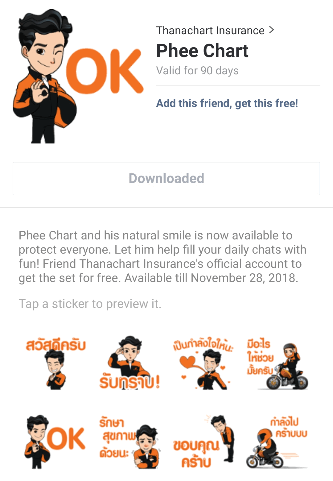 สำหรับผู้สนใจทั่วไปแม้จะไม่ได้เป็นลูกค้าก็สามารถเป็นเพื่อนกับธนชาตประกันภัยในไลน์ได้ เนื่องจาก บริษัทจะมีการนำเสนอข้อมูลข่าวสารที่เป็นประโยชน์ตลอดจนกิจกรรมต่างๆ มาให้ทุกคนได้ร่วมสนุก รวมถึงลุ้นรับสิทธิพิเศษจากพันธมิตรร้านค้าต่างๆ ที่ร่วมรายการ และหากเพิ่มเป็นเพื่อนตั้งแต่วันนี้ก็จะได้รับสติ๊กเกอร์ไลน์ชุด “พี่ชาต” ที่ได้นำคาแรคเตอร์ของเจ้าหน้าที่สำรวจภัยกับรอยยิ้มที่จริงใจและความห่วงใยพร้อมดูแลในอิริยาบถต่างๆ ไว้ส่งมอบความสุขให้คนพิเศษก่อนใครถึง 8 แบบด้วยกัน โดยจะเปิดให้ดาวน์โหลดฟรีถึงวันที่ 28 พ.ย.2561 เท่านั้น
