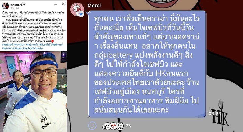 ล่าสุด เชฟมารวย โพสต์รูปคู่กับเชฟเคอร์ พร้อมขอโทษที่ไปคอมเมนต์จนเกิดดราม่า จากนั้นก็โพสต์แสดงความยินดีและให้กำลังใจเชฟเคอร์