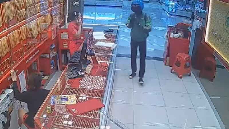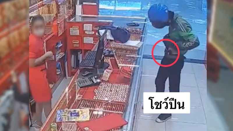คนร้ายสะพายกระเป๋าเป้ เข้ามายื่นให้พนักงานร้านทอง ก่อนจะดึงชายเสื้อโชว์กระบอกปืนที่เหน็บอยู่บริเวณเอวให้พนักงานดู และพูดบังคับให้พนักงานร้านทองกวาดสร้อยคอทองคำทั้งหมด ในระหว่างนั้น น้องพนักงานร้านทองพยายามเบี่ยงเบนดึงเวลาให้นานที่สุด พยายามพูดคุยเดินไปเดินมา