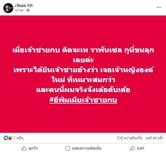 ยังคงเป็นเรื่องกระตุกต่อมเผือก ที่หลายคนให้ความสนใจ หลังจากก่อนหน้านี้ เพจ “เจ๊มอย 108” ออกมาเล่านิทาน"เจ้าชายกบ" เลิกกับเมีย ก่อนไปตามจีบ หลอกใช้"เจ้าหญิงราพันเซล" จนเกิดกระแสคู่จิ้น