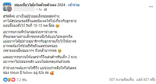 โดยระบุข้อความว่า "สวัสดีค่ะ เราเป็นผู้ป่วยมะเร็งระยะสุดท้าย เราได้สปอนเซอร์ตั๋วและบัตเจตให้ไปเที่ยวกับลูกชาย ตอนนี้จองตั๋วไว้ วันที่ 10-15 พค.นี้ค่ะ