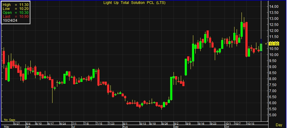 ผู้สื่อข่าวรายงานว่า วันนี้ (24 ต.ค.) ราคาหุ้น บริษัท ไลท์อัพ โทเทิล โซลูชั่น จำกัด (มหาชน) หรือ LTS ณ เวลา 11:18 น. อยู่ที่ระดับ 10.90 บาท บวก 0.60 บาท หรือ 5.83% สูงสุดที่ระดับ 11.30 บาท ต่ำสุดที่ระดับ 10.20 บาท ด้วยมูลค่าการซื้อขาย 14.49 ล้านบาท
