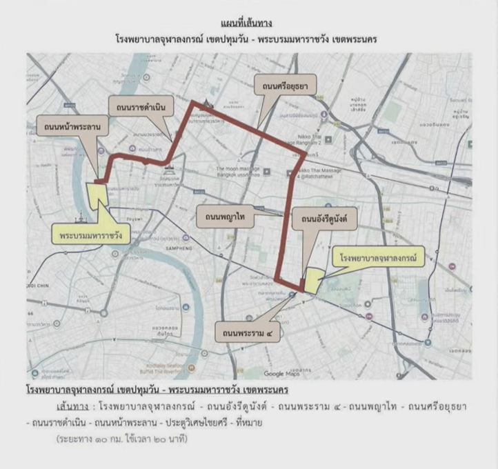 เริ่มจากโรงพยาบาลจุฬาลงกรณ์ เขตปทุมวัน - พระบรมมหาราชวัง เขตพระนคร โดยใช้เส้นทางโรงพยาบาลจุฬาลงกรณ์ - ถนนอังรีดูนังต์ - ถนนพระราม 4 - ถนนพญาไท - ถนนศรีอยุธยา - ถนนราชดำเนิน - ถนนหน้าพระลาน - ประตูวิเศษไชยศรี รวมระยะทาง 10 ก.ม. ใช้เวลา 20 นาที