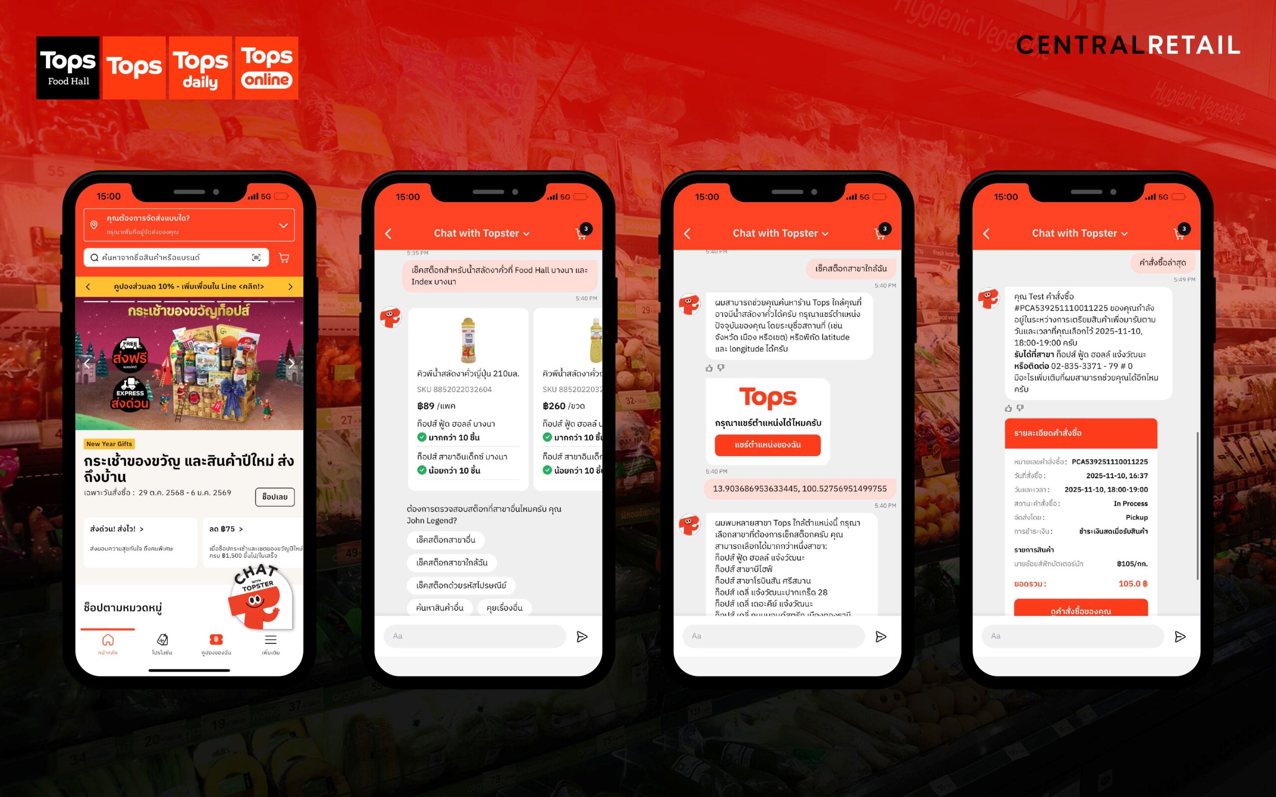 มาพร้อมฟีเจอร์ไฮไลต์ที่ให้ลูกค้าสามารถเช็กสต๊อกสินค้าภายในสาขาแบบเรียลไทม์เป็นครั้งแรก ช่วยให้ลูกค้าตรวจสอบสินค้าจากสาขาท็อปส์ใกล้บ้านได้ทันทีผ่านแชตก่อนเดินทางมายังร้าน ควบคู่กับบริการผู้ช่วยอัจฉริยะตลอด 24 ชั่วโมง โดยให้บริการ TOPS Chatbot ผ่านแอปพลิเคชั่น TOPS ONLINE