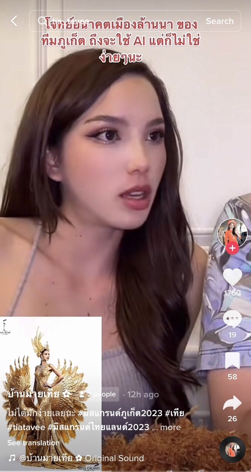 แถมยังได้สาว "เทีย" หรือชื่อจริง "เทีย ลี่ ทวีพาณิชย์พันธุ์" ที่โด่งดังมาจากเวที The Face ก่อนจะเดินสายในวงการบันเทิง วงการนางแบบ และเข้าสู่วงการนางงาม มาทำให้ชุดออกมาดูสมบูรณ์มากขึ้นไปอีก และที่สำคัญ ชุดสุดปังนี้ไม่มีอยู่จริง เพราะทำมาจาก AI ผ่าน Midjourney AI