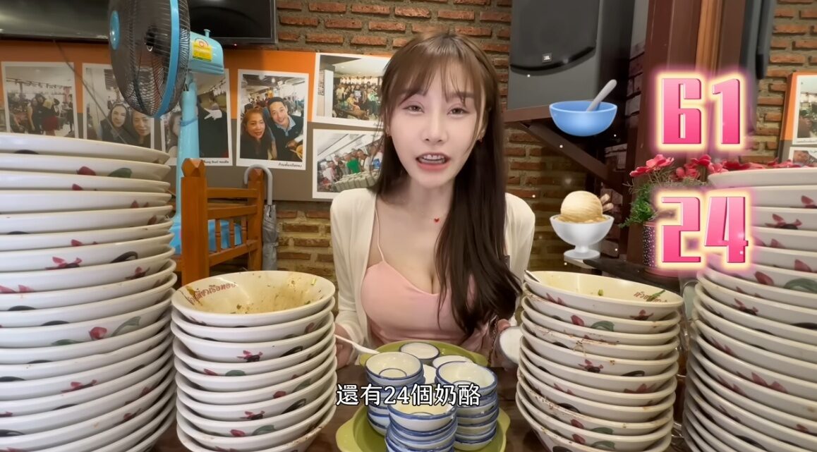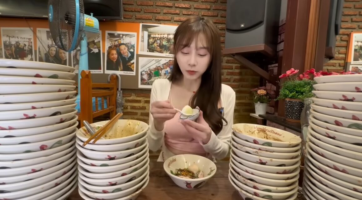 ทว่าภาพที่ทำเอาชาวเน็ตอึ้งคือ ภาพชามก๋วยเตี๋ยวเสิร์ฟจนเต็มโต๊ะ แต่ยูทูบเบอร์สาวนั่งกินคนเดียวจนชามกองซ้อนกันสูง ซึ่ง เธอกินก๋วยเตี๋ยวเรือไปทั้งหมด 61 ถ้วยและกินขนมถ้วยไปอีก 24 ถ้วย ซึ่งค่าเสียหายมื้อนี้ทั้งหมด อยู่ที่ราคา 1,180 บาท หากใครอยากติดตามความน่ารักของสาวคนนี้ สามารถติดตามได้ที่ puff_ku