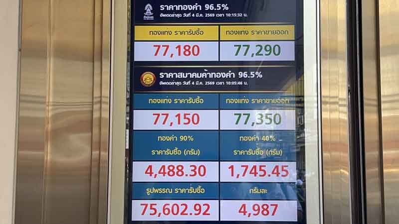 วันที่ 4 มี.ค.2569 ผู้สื่อข่าวรายงานบรรยากาศการซื้อขายทองคำในย่านเยาวราชตั้งแต่ช่วงเช้าวันนี้เป็นไปอย่างคึกคักผิดปกติ หลังราคาทองคำเปิดตลาดปรับตัวลดลงแรงถึง 1,550 บาท สร้างความฮือฮาในกลุ่มนักลงทุนและประชาชนทั่วไป ที่ติดตามสถานการณ์ราคาทองคำอย่างใกล้ชิด