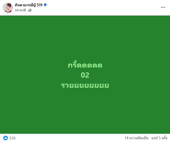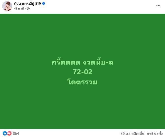 ล่าสุด เลขเข้าแบบตรงๆ เต็มๆ ทั้งเลขท้าย 2 ตัว 02 และ เลขท้ายรางวัลที่ 1 คือ 72 งานนี้ แม่น้ำหนึ่ง ถึงกับกรี๊ดลั่น พร้อมโพสต์ข้อความรัวๆว่า “กรี๊ดดดดด 02 รวยยยยยยยย” , “กรี๊ดดดด งวดนี้บ-ล 72-02 โคตรรวย”
