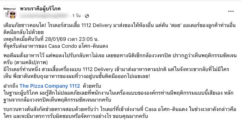 สมาชิกรายหนึ่ง โพสต์ลงในกลุ่ม พวกเราคือผู้บริโภค ระบุว่า “เตือนภัยชาวคอนโด! ไรเดอร์สวมเสื้อ 1112 Delivery มาส่งของให้ห้องอื่น แต่ดัน 'สอย' ออเดอร์ของลูกค้าท่านอื่นติดมือกลับไปด้วย เหตุเกิดเมื่อคืนวันที่ 28/01/69 เวลา 23:05 น. ที่จุดรับส่งอาหารของ Casa Condo อโศก-ดินแดง