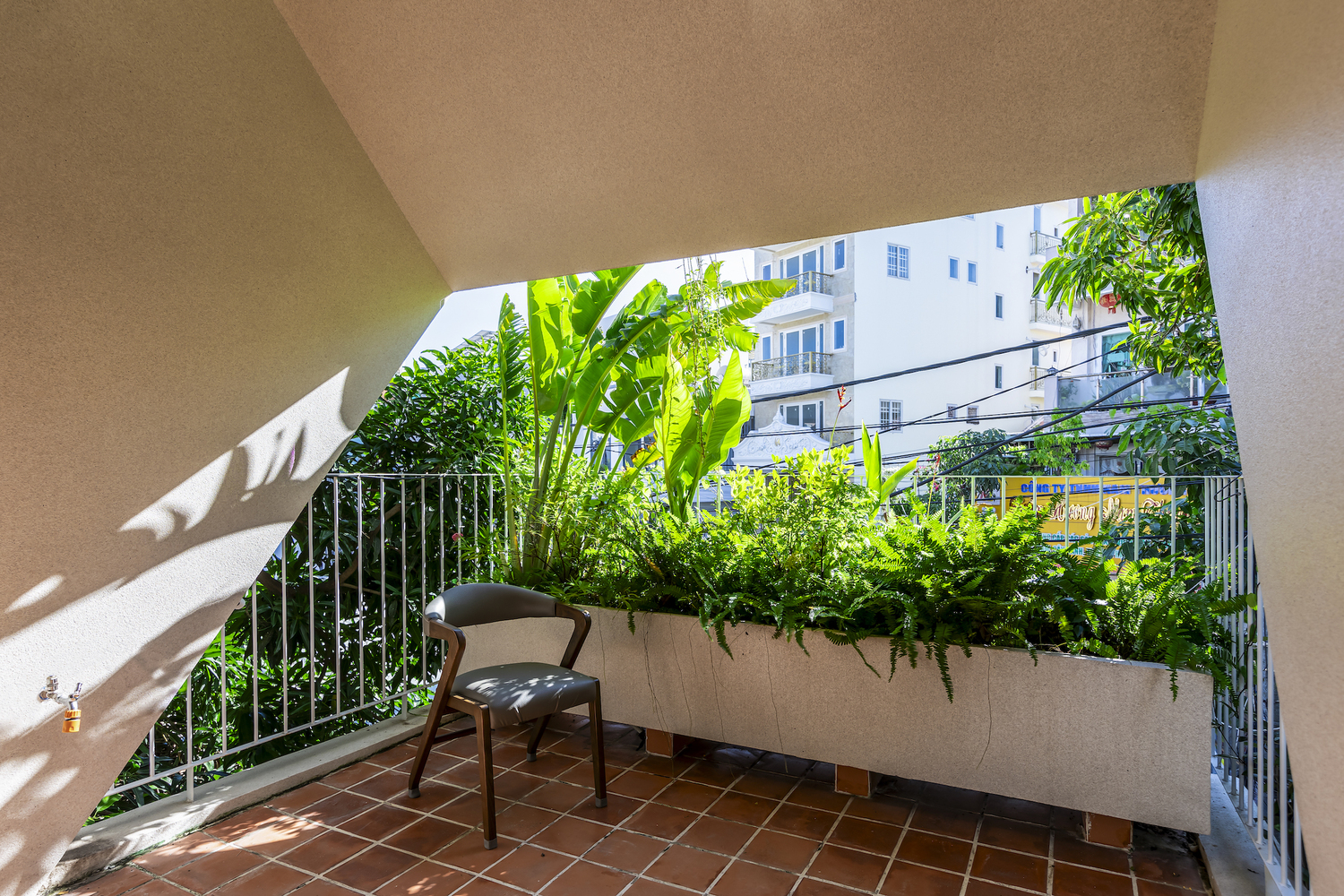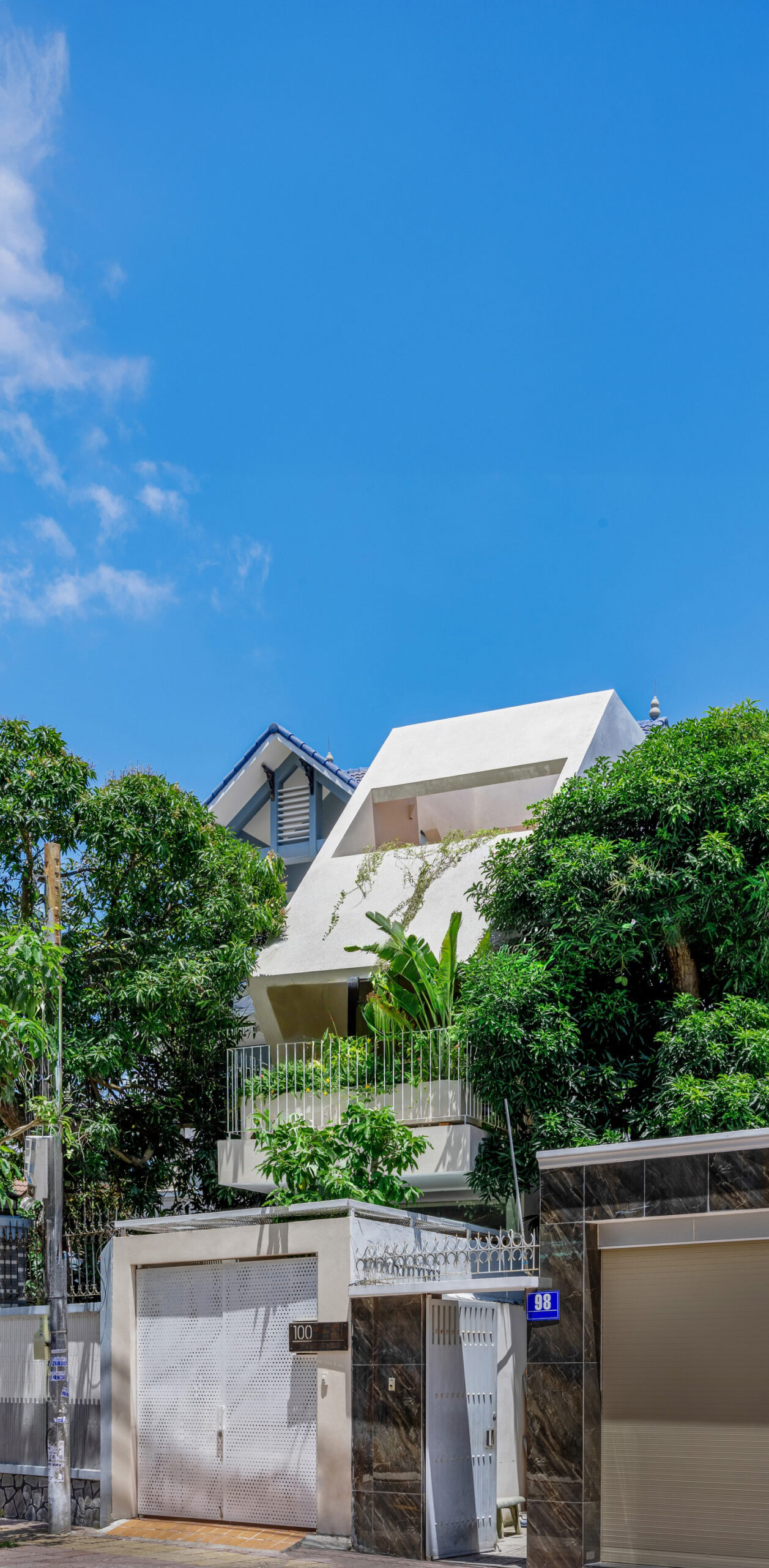 การออกแบบภายนอกที่เป็นเอกลักษณ์ หลังคาคอนกรีตที่ลาดเอียงจากชั้นบนลงมาถึงชั้นสอง พร้อมช่องระบายอากาศ สร้างความเรียบง่ายแต่โดดเด่น การจัดวางต้นไม้เป็นชั้นกันชนช่วยป้องกันความร้อนและเพิ่มความเป็นส่วนตัว
