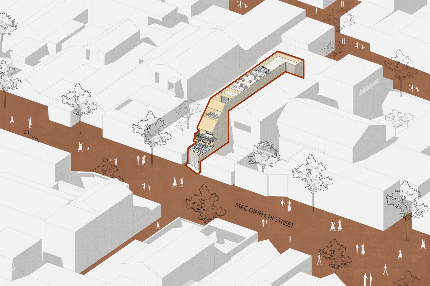 การจัดการพื้นที่อย่างชาญฉลาด แทนที่จะใช้แบบแปลนทาวน์เฮ้าส์ทั่วไปที่มีทางเดินยาว สถาปนิกเลือกแบ่งพื้นที่ตามแนวยาวของบ้าน ใช้พื้นที่ส่วนกลางเป็นเส้นทางเชื่อมต่อไปยังพื้นที่ส่วนตัวต่างๆ โดยจัดวางพื้นที่นั่งเล่นและครัวไว้กลางบ้าน ซึ่งเป็นจุดที่ใช้งานบ่อยที่สุด ใกล้กับทางเข้าหลักและช่องแสง ช่วยสร้างการปฏิสัมพันธ์ระหว่างสมาชิกครอบครัว