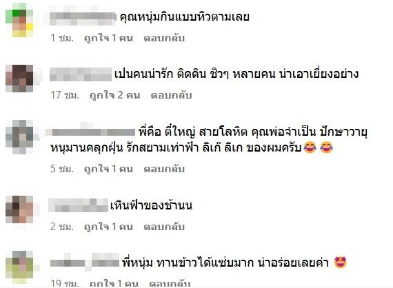 โดยแฟนๆ ต่างก็เข้ามาคอมเมนต์เห็นด้วย และชื่นชมชีวิตธรรมดาของพระเอกดัง ที่สำคัญเห็นคลิปแล้วหิวข้าวหมูแดงตามไปด้วย อาทิ