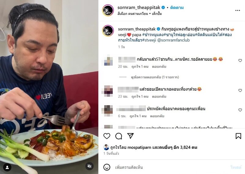 ด้าน พระเอกดังตลอดกาล หนุ่ม ศรราม นอกจากโพสต์คลิปเลี้ยงลูกสาวเต็มฟีดไปหมด ล่าสุดก็โพสต์คลิปนั่งกินข้าวหมูแดงอย่างเอร็ดอร่อย พร้อมเพลงเพื่อชีวิต เด็กปั๊ม ประกอบคลิป และระบุแคปชั่นด้วยว่า