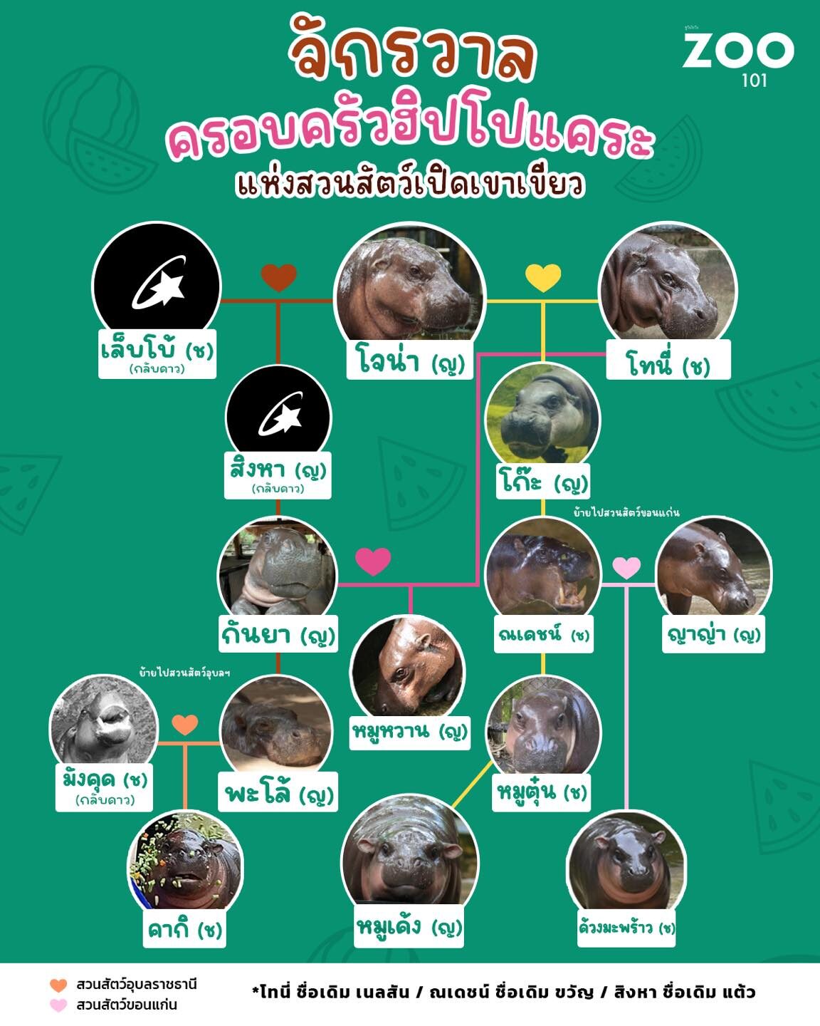 "ลูกฮิปโปโปเตมัสแคระที่เกิดใหม่ เกิดจากพ่อชื่อ ณเดชน์ อายุ 16 ปี (ลูกของพ่อโทนี่และแม่โจน่า มีศักดิ์เป็นพี่ชายของหมูเด้ง) โดยได้รับความเคราะห์จากสวนสัตว์เปิดเขาเขียว จ.ชลบุรี นำมาจัดแสดง และแม่ชื่อ ญาญ่า อายุ 22 ปี ได้รับความเคราะห์จากสวนสัตว์นครราชสีมา นำมาจัดแสดง"
