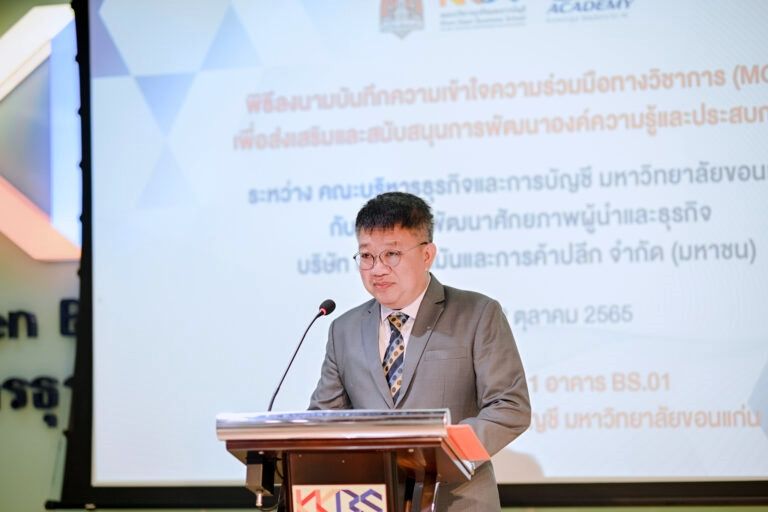 วันที่ 17 ต.ค.65 คณะบริหารธุรกิจและการบัญชี มหาวิทยาลัยขอนแก่น (มข.) จัดพิธีลงนามบันทึกความเข้าใจความร่วมมือทางวิชาการเพื่อส่งเสริมและสนับสนุนการพัฒนาองค์ความรู้และประสบการณ์ ระหว่าง คณะบริหารธุรกิจและการบัญชี มหาวิทยาลัยขอนแก่น กับ สถาบันพัฒนาศักยภาพผู้นำและธุรกิจ บริษัท ปตท. น้ำมันและการค้าปลีก จำกัด (มหาชน) โดยมี ผู้ช่วยศาสตราจารย์ ดร.เด่นพงษ์ สุดภักดี รองอธิการบดีฝ่ายดิจิทัล มหาวิทยาลัยขอนแก่น เป็นประธานในพิธี รองศาสตราจารย์ ดร.เพ็ญศรี เจริญวานิช คณบดีคณะบริหารธุรกิจและการบัญชี เป็นผู้กล่าวรายงาน ผู้ช่วยศาสตราจารย์ ศักดิ์สุริยา ไตรยราช ผู้ช่วยคณบดีฝ่ายการเรียนรู้ตลอดชีวิตและเครือข่าย กล่าวสรุปบันทึกข้อตกลงความร่วมมือทางวิชาการ (MOU) นายมนชัย บุญอิ่ม ผู้จัดการฝ่ายสถาบันพัฒนาศักยภาพผู้นำและธุรกิจ บริษัท ปตท.น้ำมันและการค้าปลีก จำกัด (มหาชน) หรือ OR กล่าวถึงการสนับสนุนความร่วมมือการดำเนินงาน และ ร่วมลงนามในบันทึกความเข้าใจความร่วมมือทางวิชาการ ณ ห้องวังเลิศ ชั้น 1 อาคาร BS.01 คณะบริหารธุรกิจและการบัญชี มหาวิทยาลัยขอนแก่น