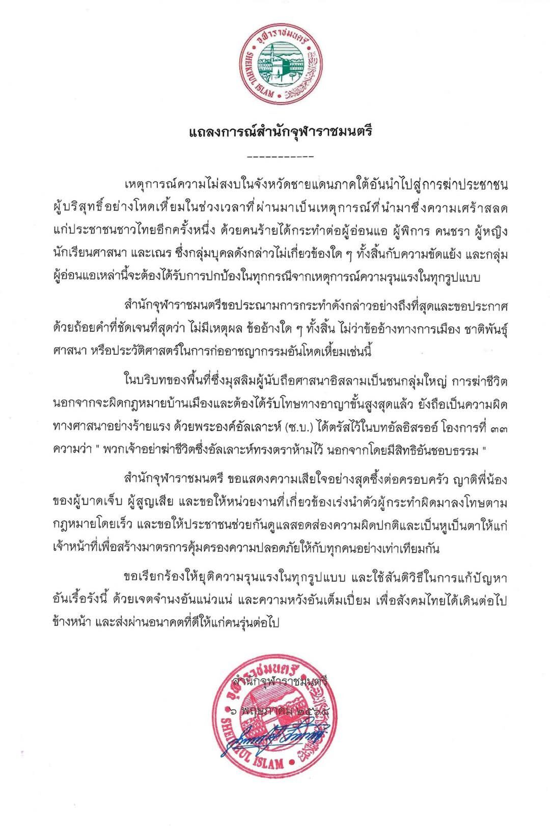 อ่านข่าวต้นฉบับได้ที่ : จุฬาราชมนตรี แถลงประณามเหตุไฟใต้ สังหารโหดเหี้ยม ผิดหลักศาสนาร้ายแรง