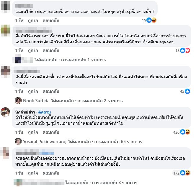 เพจ นิกกี้ขยี้ข่าว ก็เข้ามาคอมเมนต์ด้วยว่า “ถ้าไวน์มันชั่วขนาดนั้นทนายเก่งให้เอ๋คบทำไม เพราะทนายเป็นคนพูดเองว่าเป็นคนเชียร์ให้คบกัน และถ้าไวน์มันชั่ว รู.. รูบี้ จะเอามาทำน้ำหอมกับทนายเก่งทำไม”