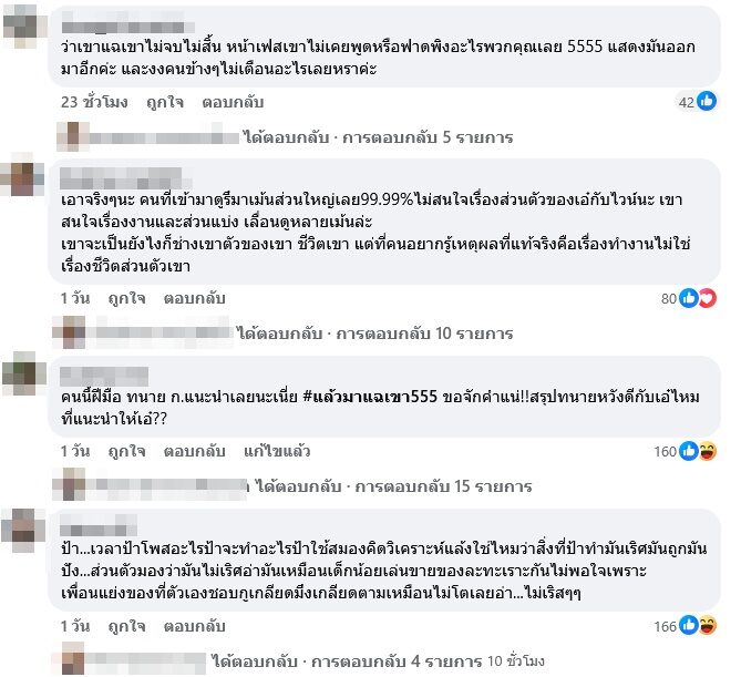 -เอาจริงๆนะ คนที่เข้ามาดูรึมาเม้นส่วนใหญ่เลย99.99%ไม่สนใจเรื่องส่วนตัวของเอ๋กับไวน์นะ เขาสนใจเรื่องงานและส่วนแบ่ง เลื่อนดูหลายเม้นล่ะ เขาจะเป็นยังไงก็ช่างเขาตัวของเขา ชีวิตเขา แต่ที่คนอยากรู้เหตุผลที่แท้จริงคือเรื่องทำงานไม่ใช่เรื่องชีวิตส่วนตัวเขา