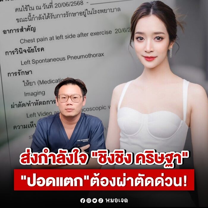 วันที่ 23 มิ.ย.2568 ผู้สื่อข่าวรายงานว่า นพ.เจษฎ์ บุณยวงศ์วิโรจน์ รองผู้อำนวยการโรงพยาบาลมหาราชนครราชสีมา โพสต์ภาพข้อความผ่านเพจเฟซบุ๊กชื่อ "หมอเจด" ระบุว่า ส่งกำลังใจ "ชิงชิง คริษฐา" ปอดแตก ต้องผ่าตัดด่วน