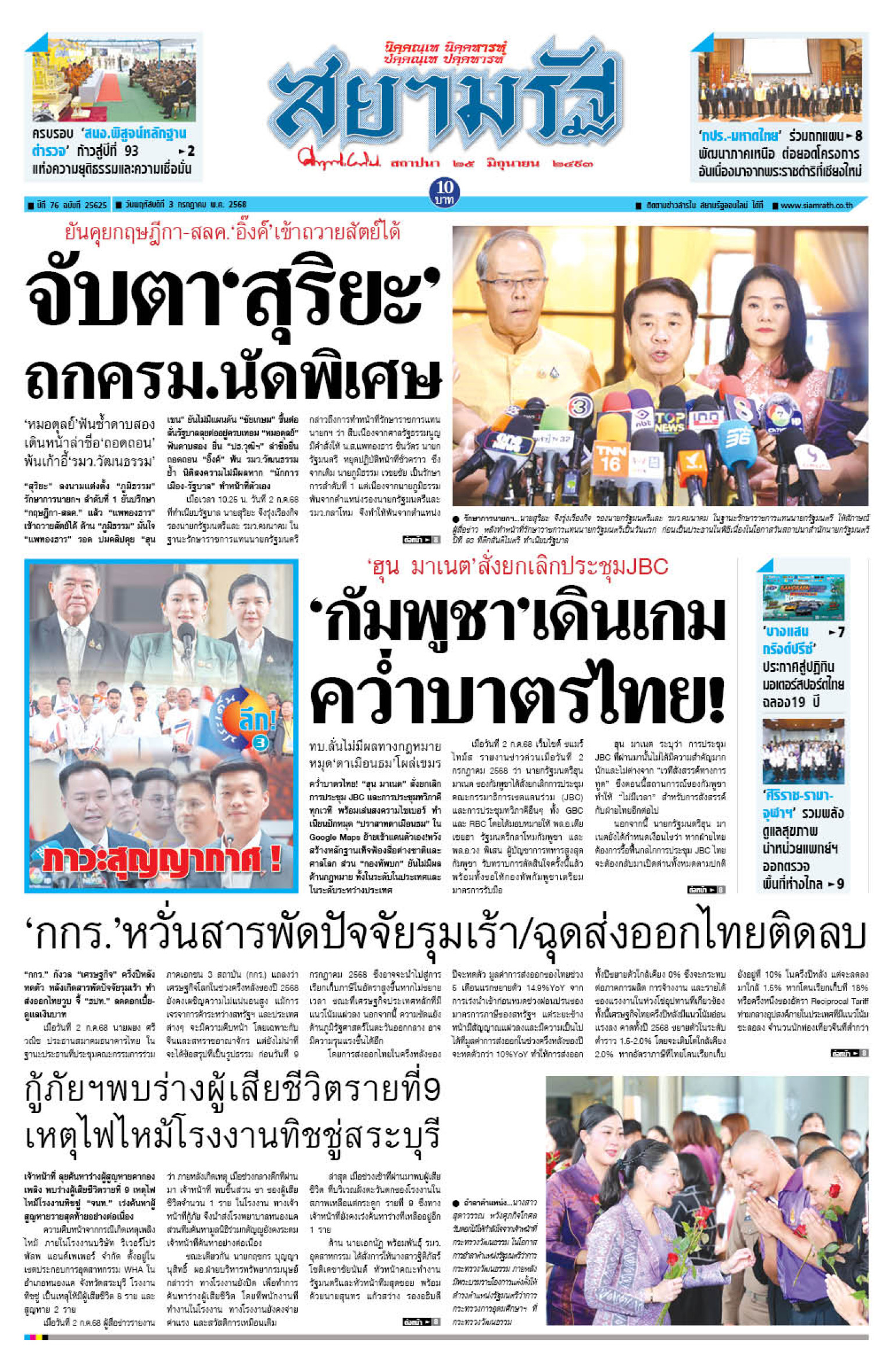 หน้า 1 หนังสือพิมพ์สยามรัฐรายวัน ฉบับวันพฤหัสบดีที่ 3 กรกฎาคม 2568