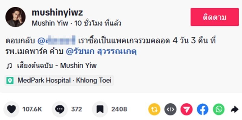 โดย ยิว โพสต์คลิปตอบคนเข้ามาถาม “คืนเท่าไหร่ค่ะสวยและกว้างมาก” ว่า “เราซื้อเป็นแพคเก็จรวมคลอด 4 วัน 3 คืน ที่ รพ.เมดพาร์ค ค้าบ ประทับใจครับ”