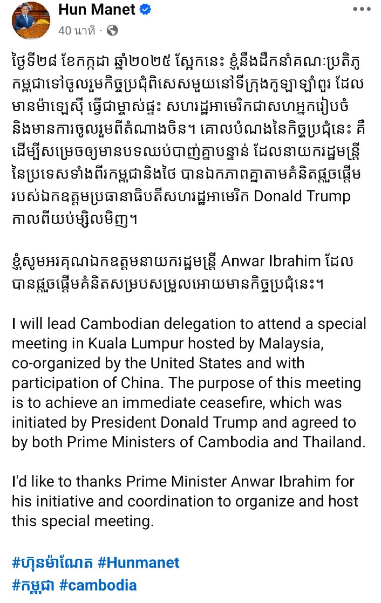 วันที่ 27 ก.ค.68 ฮุน เนต นายกรัฐมนตรีกัมพูชา โพสต์เฟซบุ๊กระบุว่า "ผมจะเป็นผู้นำคณะผู้แทนกัมพูชาในการเข้าร่วมการประชุมพิเศษที่กรุงกัวลาลัมเปอร์ ซึ่งจัดโดยประเทศมาเลเซีย ร่วมกับสหรัฐอเมริกา และมีจีนเข้าร่วมด้วย จุดประสงค์ของการประชุมครั้งนี้คือเพื่อบรรลุข้อตกลงหยุดยิงโดยทันที ซึ่งริเริ่มโดยประธานาธิบดีโดนัลด์ ทรัมป์ และได้รับการเห็นชอบจากนายกรัฐมนตรีของกัมพูชาและประเทศไทยทั้งสองฝ่าย