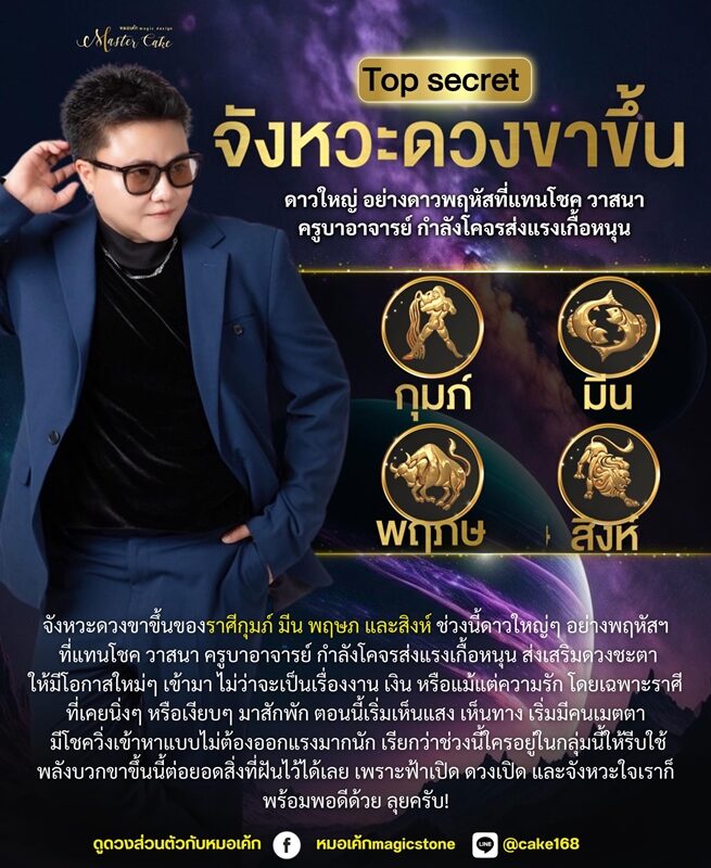 หมอเค้ก Magic stone เปิดดวงชะตา 4 ราศี จังหวะดวงขาขึ้น ดาวใหญ่อย่างดาวพฤหัสที่แทนโชค วาสนา ครูบาอาจารย์ กำลังโคจรส่งแรงเกื้อหนุน ประกอบด้วย ราศีกุมภ์ ราศีมีน ราศีพฤษภ และราศีสิงห์