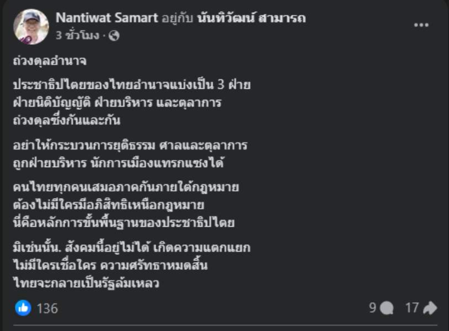 "นันทิวัฒน์" เตือน ถ่วงดุลอำนาจฝ่ายบริหาร-นิติบัญญัติ-ตุลาการสำคัญเพื่อประชาธิปไตย