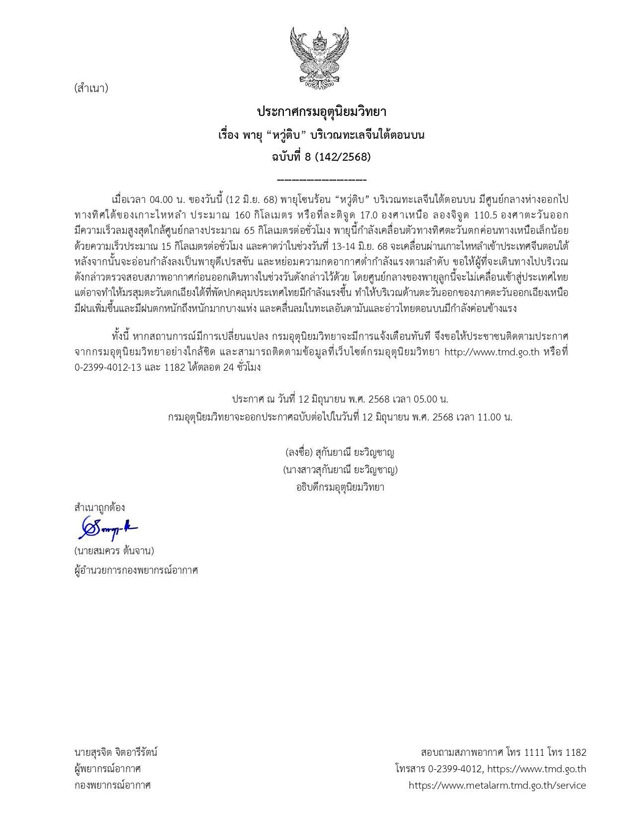 วันที่ 12 มิ.ย.2568 กรมอุตุนิยมวิทยา ประกาศกรมอุตุนิยมวิทยา เรื่อง พายุ “หวู่ติบ” บริเวณทะเลจีนใต้ตอนบน ฉบับที่ 8 (142/2568) ความว่า เมื่อเวลา 04.00 น. ของวันนี้ (12 มิ.ย. 68) พายุโซนร้อน “หวู่ติบ” บริเวณทะเลจีนใต้ตอนบน มีศูนย์กลางห่างออกไปทางทิศใต้ของเกาะไหหลำ ประมาณ 160 กิโลเมตร หรือที่ละติจูด 17.0 องศาเหนือ ลองจิจูด 110.5 องศาตะวันออก มีความเร็วลมสูงสุดใกล้ศูนย์กลางประมาณ 65 กิโลเมตรต่อชั่วโมง