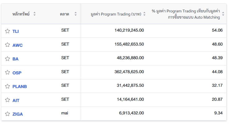 นอกจากนี้ ตลท.ยังรายงานข้อมูลหลักทรัพย์ที่ใช้ Program Trading ซื้อขายสูงสุด 7 อันดับ โดยเรียงจากเปอร์เซ็นต์ (%) มูลค่า Program Trading เทียบกับมูลค่าการซื้อขายแบบ Auto Matching ดังนี้