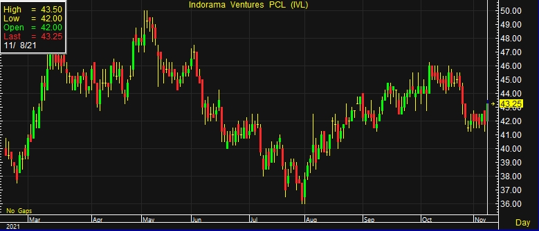 ผู้สื่อข่าวรายงานว่าวันนี้ (8 พ.ย. 64) ราคาหุ้นของบริษัท อินโดรามา เวนเจอร์ส จำกัด (มหาชน) หรือ IVL โดย ณ เวลา 15:13 น. อยู่ที่ระดับ 43.25 บาท บวก 1.50 บาท หรือ 3.59% โดยทำจุดสูงสุดที่ 43.50 บาท และต่ำสุดที่ 42.00 บาท ด้วยมูลค่าการซื้อขาย 960.46 ล้านบาท