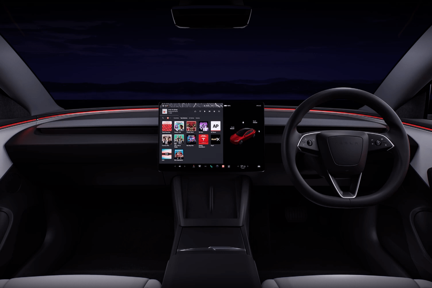 ภายในใหม่หมดลบภาพจำเดิมๆเด่นด้วยส่วนประกอบจาก suspended elements เทคโนโลยีสิ่งทอและขอบอะลูมิเนียมแบบด้าน ที่เรียบง่ายและกลมกลืน ให้ความสำคัญกับความยั่งยืนและคำนึงถึงสภาพแวดล้อมห้องโดยสารที่ดีต่อสุขภาพ ชุดแผงคอนโซลหน้าดีไซน์ใหม่เรียบง่ายกว่าเดิมพร้อมชุดแต่งแผงคอนโซลหน้านแนวนอน พวงมาลัยมัลติฟังก์ชันสามก้านติดตราโลโก้ตัวอักษร TESLA แทนโลโก้ตัวทีควบคุมแบบ Joy Stick 2 ปุ่มช่วยลดความยุ่งยากในการขับขี่ ผู้ขับขี่สามารถคลิกเพียงครั้งเดียวเพื่อเข้าถึงฟังก์ชันสำคัญต่างๆ เช่น สัญญาณไฟเลี้ยวและไฟสูง นอกจากนี้ ตัวควบคุมทางฝั่งด้านซ้ายยังสามารถปรับโหมดการเร่งความเร็ว ความสว่างหน้าจอ และการตั้งค่าอื่นๆ เพิ่มเติมได้อีกด้วย