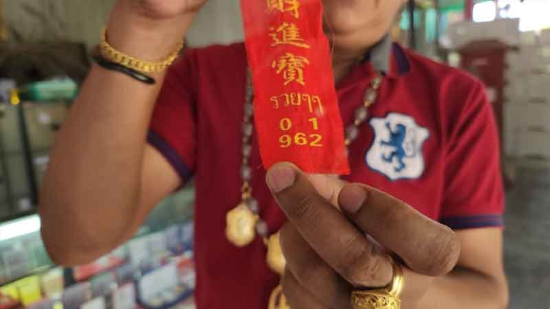 ซึ่งไม่คาดคิดว่าจะถูกเลขนี้ด้วยซ้ำ วันนี้จึงได้นำสลากกินแบ่งมาโชว์และนำข้าวกล่องมาแจกที่โรงทานเพื่อให้กับผู้ที่มาทำบุญได้กินกัน รวมถึงแจกเงินขวัญถุงและเชิดสิงโตถวาย นอกจากนี้ยังจุดประทัดแก้บนถวายท้าวหิรัญพนาสูรที่ใหญ่ที่สุดในประเทศไทยอีก 10,000 นัด หลังเสร็จสิ้นการจุดประทัดแล้ว ปรากฏเป็นหมายเลข 0 1 และ 9 6 2 ซึ่งสำหรับทุกสิ่งทุกอย่างที่ได้ทำในวันนี้ ถือเป็นการแก้บนถวายให้กับท้าวหิรัญพนาสูร ที่ตนได้รับโชคใหญ่