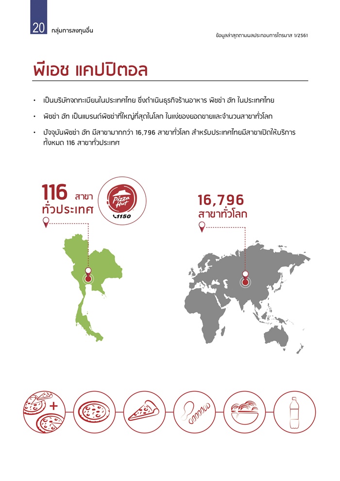 ธุรกิจอาหารและเครื่องดื่ม พีเอซ แคปปิ ตอล (PHC) ซึ่งเป็นผู้รับสิทธิ์แฟรนไชส์ พิซซ่าฮัท รายเดียวในประเทศไทย ได้ขยายสาขาเพิ่มอีก 8 สาขาในไตรมาส 1/2561 ส่วนใหญ่เป็นสาขาในต่างจังหวัด โดย ณ วันที่ 31 มีนาคม 2561 พิซซ่า ฮัท มีจำนวนสาขาทั้งสิ้น 116 สาขา ทั่วประเทศ