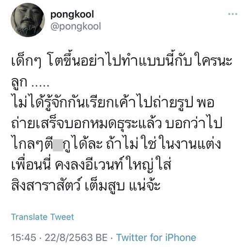 ทั้งนี้ป๊อบ ได้โพสต์ถึงเหตุการณ์ดังกล่าว ระบายความรู้สึกผ่านทางทวิตเตอร์ส่วนตัวว่า “เด็กๆ โตขึ้นอย่าไปทำแบบนี้กับใครนะลูก ….. ไม่ได้รู้จักกันเรียกเค้าไปถ่ายรูป พอถ่ายเสร็จบอกหมดธุระแล้ว บอกว่าไปไกลๆ ตีนกูได้ละ ถ้าไม่ใช่ในงานแต่งเพื่อนนี่ คงลงอีเวนต์ใหญ่ใส่สิงสาราสัตว์ เต็มสูบ แน่จ้ะ”