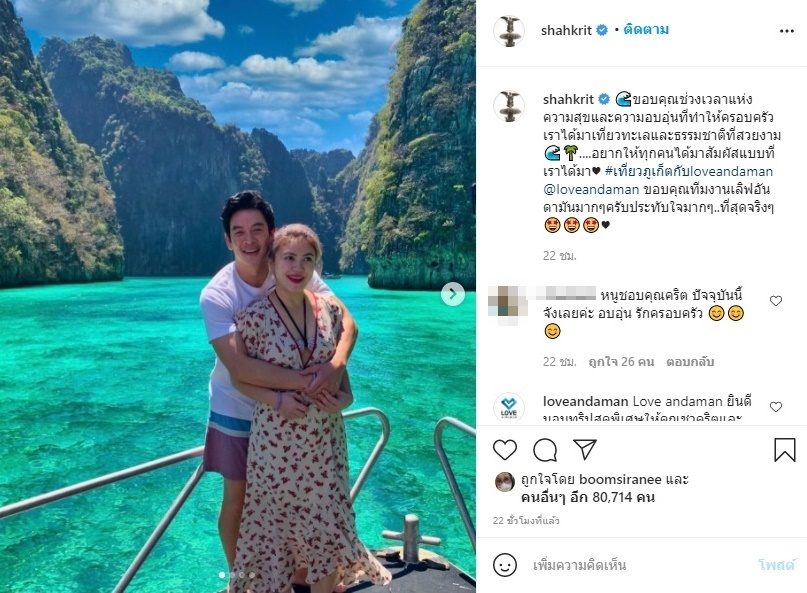 ล่าสุดสามีโพสต์ภาพรัวๆโมเมนต์สวีต แอน ภรรยา พร้อมบอกว่า “ขอบคุณช่วงเวลาแห่งความสุขและความอบอุ่นที่ทำให้ครอบครัวเราได้มาเที่ยวทะเลและธรรมชาติที่สวยงาม….อยากให้ทุกคนได้มาสัมผัสแบบที่เราได้มา #เที่ยวภูเก็ตกับloveandaman @loveandaman ขอบคุณทีมงานเลิฟอันดามันมากๆครับประทับใจมากๆ..ที่สุดจริงๆ”
