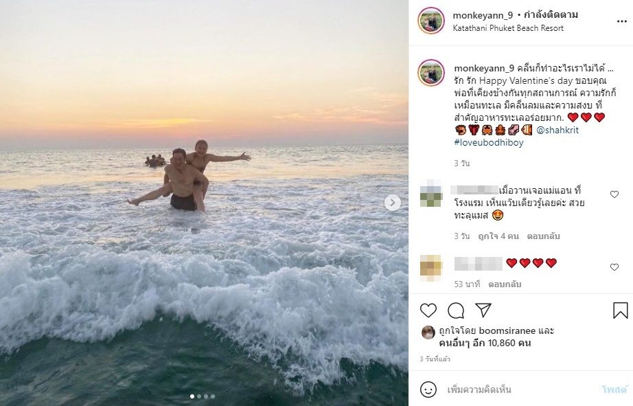 “คลื่นก็ทำอะไรเราไม่ได้ … รัก รัก Happy Valentine’s day ขอบคุณพ่อที่เคียงข้างกันทุกสถานการณ์ ความรักก็เหมือนทะเล มีคลื่นลมและความสงบ ที่สำคัญอาหารทะเลอร่อยมาก. @shahkrit #loveubodhiboy” พร้อมทั้งเผยภาพครอบครัวพ่อแม่ลูกกับโมเมนต์สุดแฮปปี้ด้วยว่า “Happy @shahkrit #loveubodhiboy 2ขวบ9 เดือนกว่าๆ”