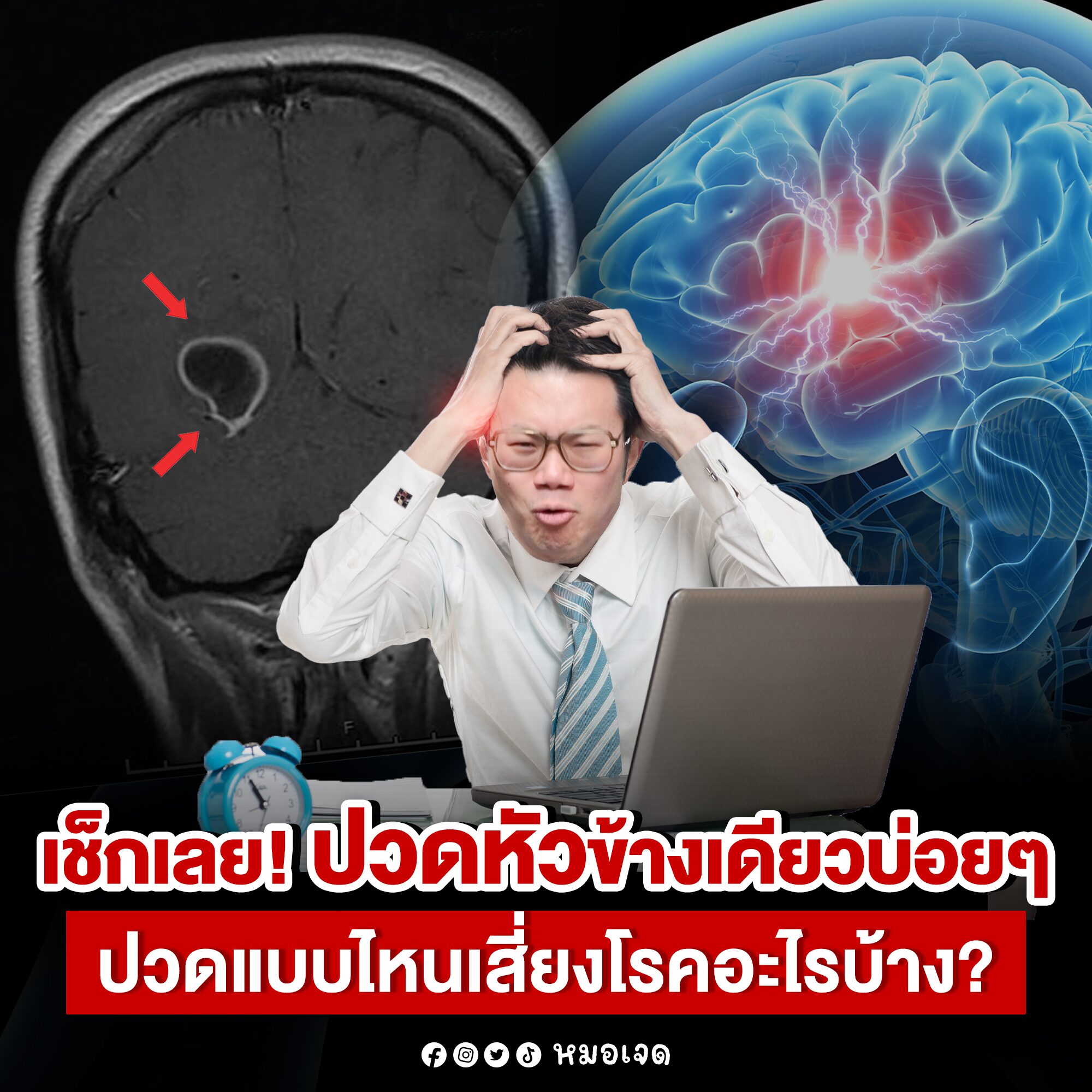 เวลาปวดหัวไม่ใช่แค่ดูว่าปวดข้างซ้ายหรือขวาเสี่ยงโรคอะไรเพียงอย่างเดียวนะครับ แต่จะดูจากลักษณะการปวด ความรุนแรง ระยะเวลา ความถี่ และอาการร่วมเป็นหลัก ถ้าปวดหัวข้างเดียวบ่อยขึ้น ปวดแรงขึ้นเรื่อย ๆ หรือมีอาการทางระบบประสาทร่วมด้วย