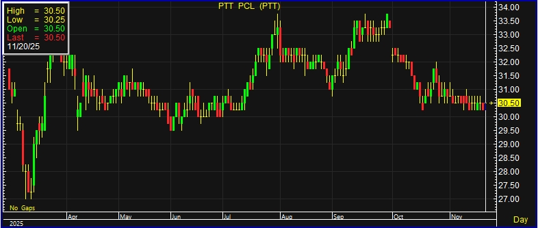 อย่างไรก็ตาม มองว่าจุดแข็งสำคัญของ PTT คือการมีธุรกิจที่กระจายตัว (Diversified Portfolio) ช่วยลดความผันผวนของกำไร เนื่องจากธุรกิจแข็งแรงบางส่วนสามารถชดเชยธุรกิจที่อ่อนตัวลงได้ แม้ภาพรวมอุตสาหกรรมยังไม่ฟื้นเต็มที่ อีกทั้งยังเป็นหุ้นปันผลเด่น โดยให้อัตราผลตอบแทนเฉลี่ยราว 6.9% ต่อปี ราคาเป้าหมาย 36 บาท