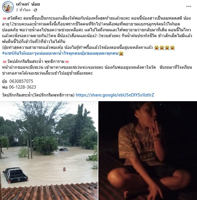 สวัสดีค่ะ ตอนนี้ขอเป็นกระบอกเสียงให้พ่อกับน้องครั้งสุดท้ายเเล้วนะคะ ตอนนี้น้องสาวเป็นลมหมดสติ น้องอายุ 12 ขวบคะ เเละน้ำท่วมครั้งนี้เกือบพรากชีวิตคนที่รักไป 1 คน คือพ่อที่พยายามเเบกๆ ลูกๆ 4 คนใว้ไห้รอดปลอดภัย