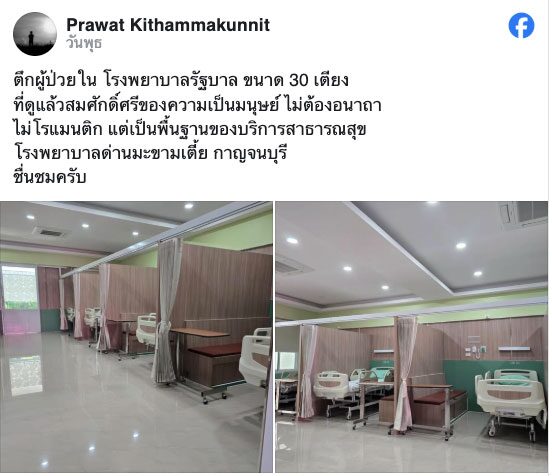 อ่านข่าวต้นฉบับได้ที่ : แชร์สนั่น ภาพหอผู้ป่วยใน รพ.รัฐ เหมือนฝันไป เห็นศักดิ์ศรีความเป็นมนุษย์