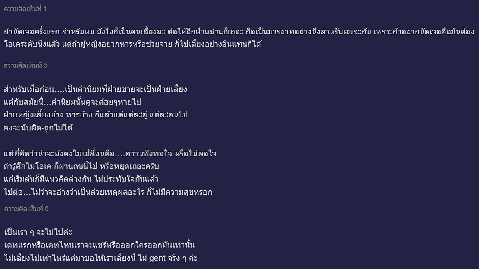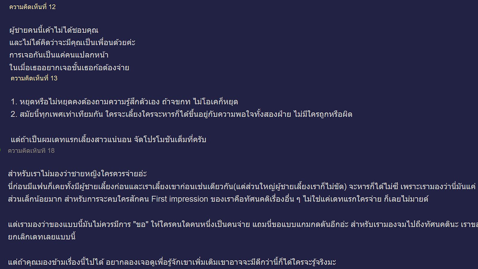 สำหรับความเห็นชาวเน็ต ส่วนใหญ่แนะนำว่า ไม่ว่าจะเป็นผู้ชายหรือผู้หญิง ของแบบนี้มันไม่ควรมีการ "ขอ" ให้ใครคนใดคนหนึ่งเป็นคนจ่าย แถมยังมาพูดแบบกดดันอีกว่า ต้องจ่ายนะ สิ่งเหล่านี้สะท้อนให้เห็นถึงทัศนคติหลายอย่าง แค่เริ่มต้นก็ทำให้ไม่ประทับใจเสียแล้ว แนะนำว่ายกเลิกเดทไปเสียดีกว่า