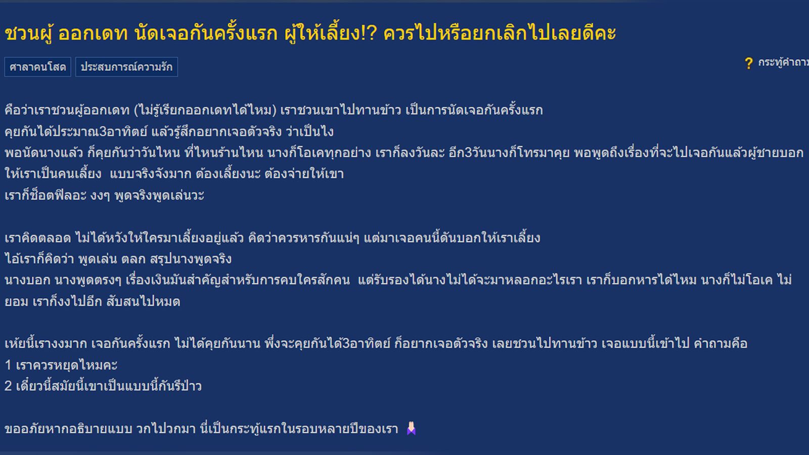 เมื่อวันที่ 23 ธันวาคม สมาชิกหมายเลข 1820552 ได้ตั้งกระทู้ปรึกษาปัญหาความรัก หลังจากที่เธอลองชวนหนุ่มคนคุยไปเดท แต่เขากลับเสนอให้เธอเป็นฝ่ายเลี้ยงข้าว แถมพูดคุยแบบจริงจัง เธอถึงกับไปไม่เป็นเลยทีเดียว