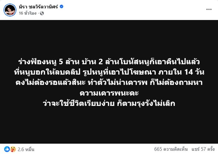 ด้าน เอ๋ มิรา ก็ได้โพสต์โต้ด้วยว่า “ร่างฟ้องหนู 5 ล้าน บ้าน 2 ล้านโบนัสหนูก็เอาคืนไปแล้ว ที่หนูบอกให้ลบคลิป รูปหนูที่เอาไปโฆษณา ภายใน 14 วัน คงไม่ต้องรอแล้วสินะ ทำตัวไม่น่าเคารพ ก็ไม่ต้องถามหาความเคารพนะคะ ว่าจะใช้ชีวิตเรียบง่าย ก็ตามรุงรังไม่เลิก”