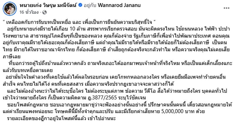 อยู่กับทนายเก่งมีรายได้เกือบ 10 ล้าน สรรพากรเรียกตรวจสอบ มันจะผิดตรงไหน ใช้ถนนหลวง ไฟฟ้า ประปา โรงพยาบาล สาธารณูปโภคอื่นๆที่เป็นของหลวง คุณก็ต้องจ่าย รัฐเก็บภาษีก็เพื่อนำไปพัฒนาประเทศ ตอนคุณอยู่กับเราคุณมีรายได้เยอะคุณก็ต้องเสียภาษี แต่ถ้าคุณไม่มีรายได้หรือมีรายได้น้อยก็ไม่ต้องเสียภาษี เป็นคนไทย มีรายได้ในราชอาณาจักรไทย ก็ต้องเสียภาษี ถ้าเสียถูกต้องจริงจะกลัวทำไม หรือความจริงคุณไม่เคยเสียภาษีเลย”
